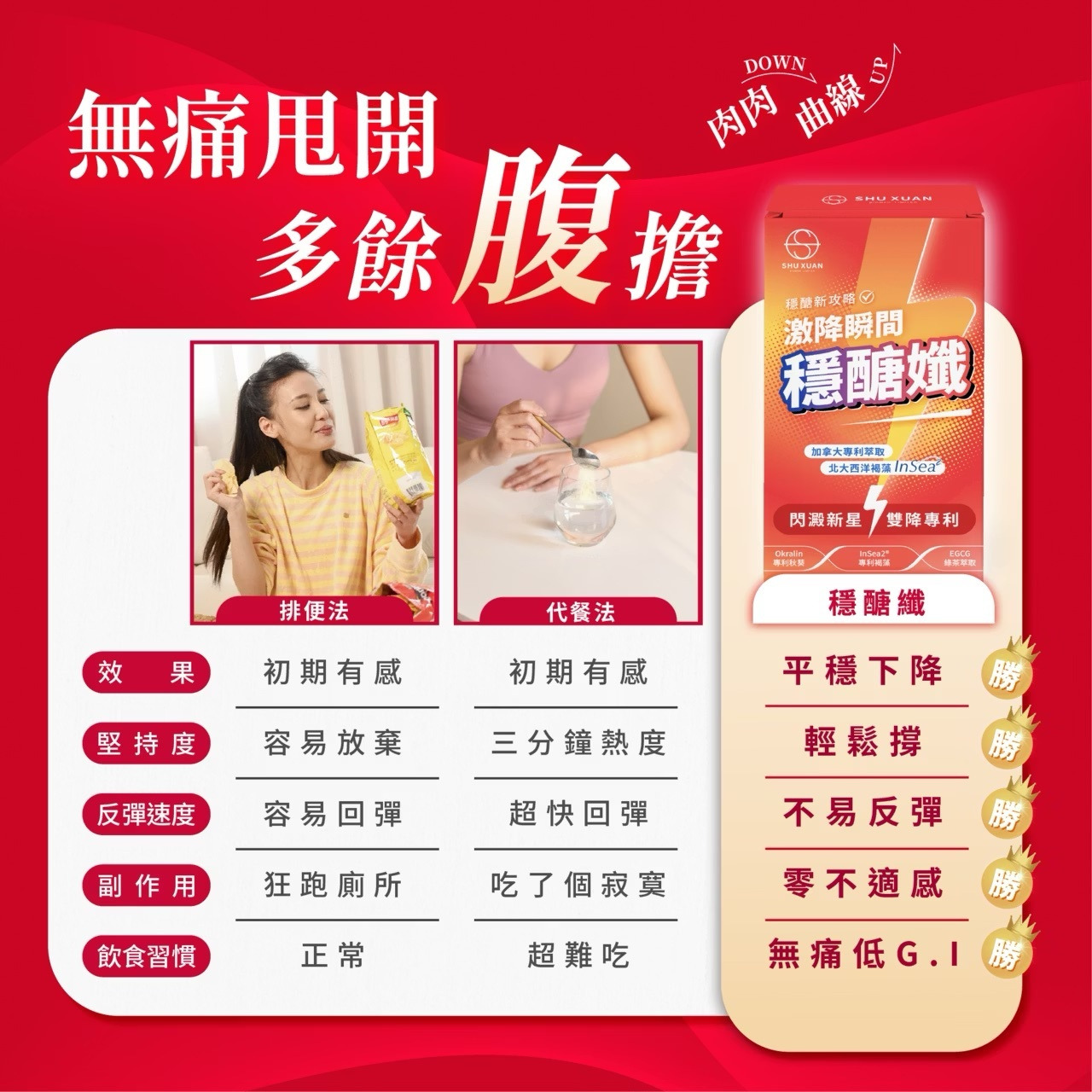 穩醣孅,不強調挨餓法(當然有飲控效果更卓越),而是透過每餐前 15 分鐘,先幫這餐上個保護膜,讓身體進入閃澱、閃油的最佳狀態,減少澱粉吸收的【腹】擔。